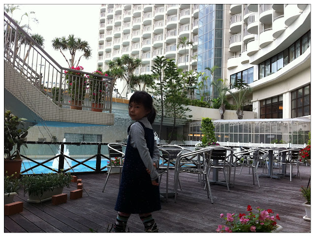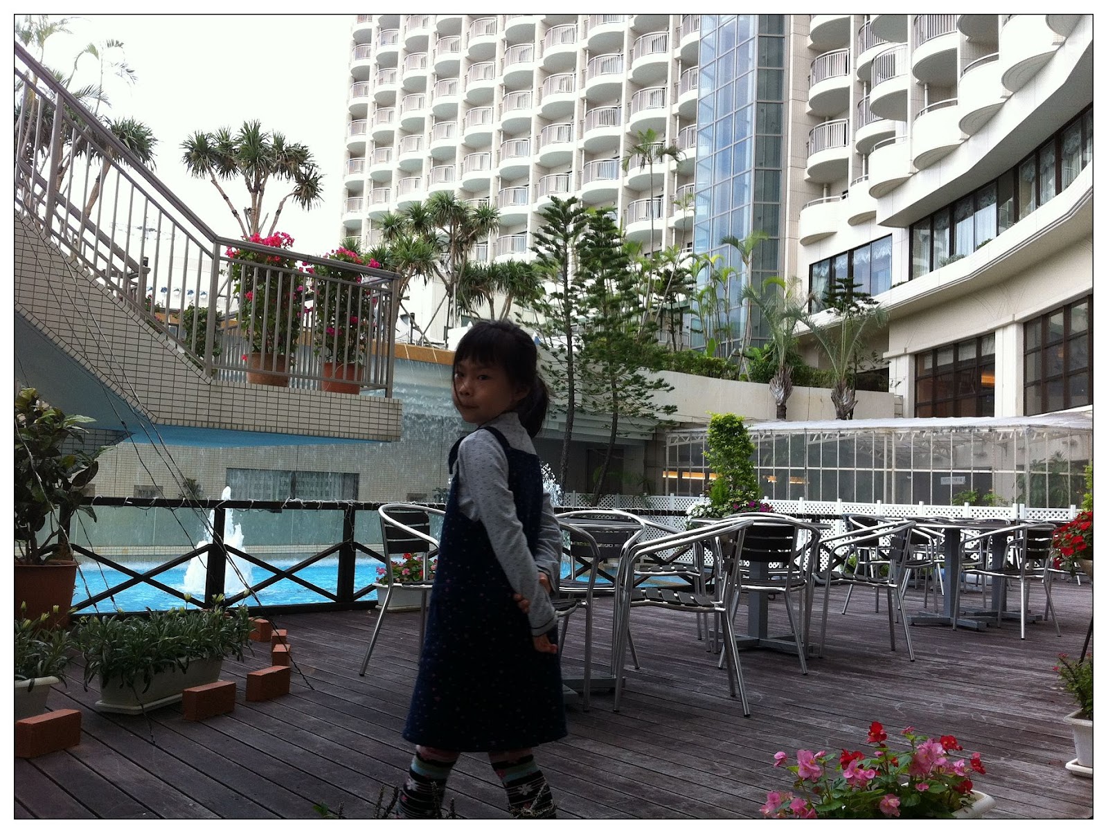 吃完早餐逛一下飯店,我門的房間就在中間的電梯右邊往上數第三個陽台
